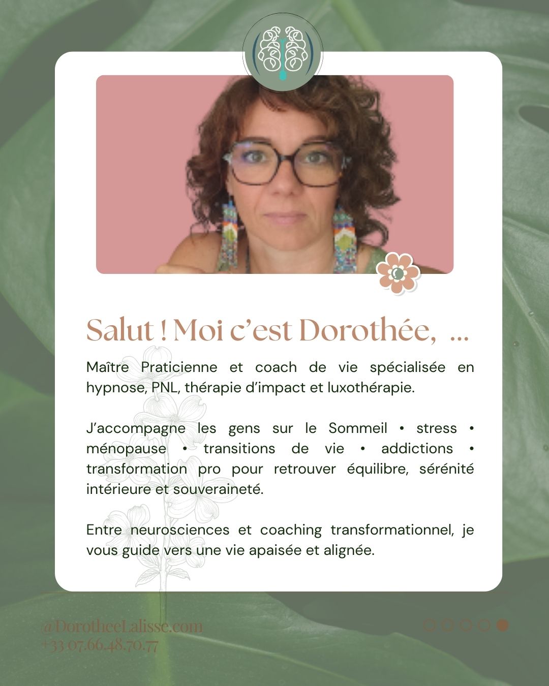 Une très belle rencontre, Dorothée m aide à supprimer mes bouffées de chaleur et sueurs nocturnes grâce à la luxopuncture et l hypnose. Ses conseils , me permettent d avancer, de lever des bocages et tout devient possible. Merci Dorothée pour ton écoute, ta bienveillance.